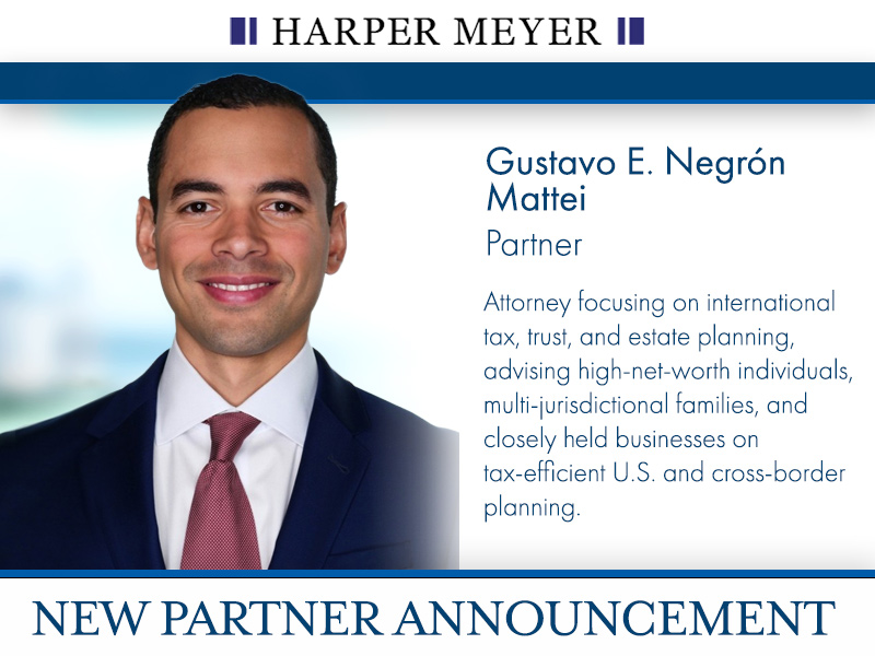 Harper Meyer is proud to announce the promotion of Gustavo E. Negrón Mattei to Partner, effective January 2026. Gustavo has been a key member of our international tax, trust, and estate planning team, advising high-net-worth individuals, multi-jurisdictional families, and closely held businesses on tax-efficient U.S. planning and cross-border structuring, including trust and foundation arrangements.